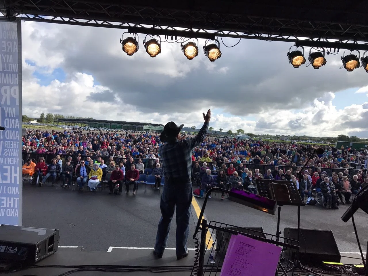 They ushered me into a tent where I sat with the rain pouring down and running all over the tarmac surface. Five minutes before 1pm it was still pouring with rain. But at 1 o’clock on the dot, the rain stopped, the clouds parted and the sun came shining through. We walked out of the tent onto a dry assembly point, with cars flooding in and the Irish people coming out to pray to The Living God (The Weatherman indeed) and to ask Him to undertake for their Nation.